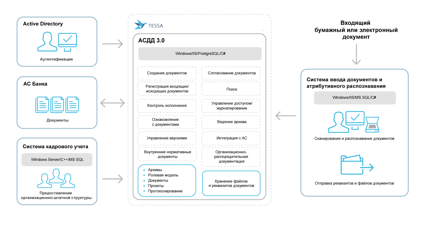 К настоящему моменту АСДД на базе TESSA используется в качестве целевой системы документооборота и делопроизводства для всего Банка. Она управляет полным жизненным циклом входящих, исходящих, внутренних, организационно-распорядительных и нормативных документов, резолюций, поручений, договоров и протоколов.