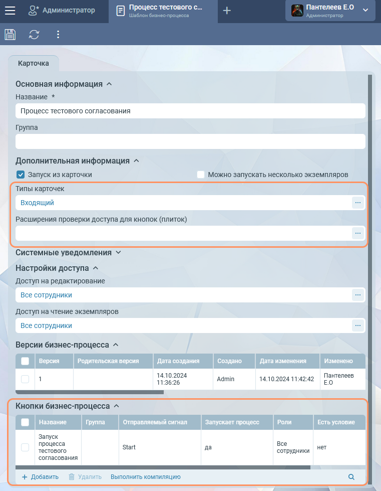- Типы карточек - типы карточек, из которых будет доступен запуск процесса (при этом должен быть выставлен флаг Запуск из карточки).