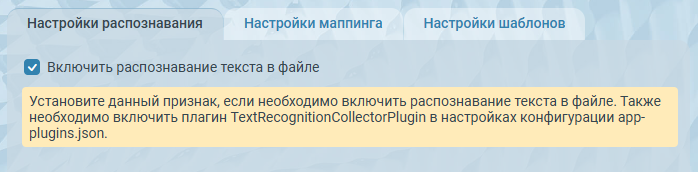 TextRecognitionCollectorPlugin, выставив в конфигурационном файлеapp-plugins.jsonдля соответствующего плагина в параметрEnabledзначениеtrue. Подробнее о плагинах см. в разделе Настройка плагинов. - Включить функциональность распознавания текста в карточке “Настройки распознавания текста”.