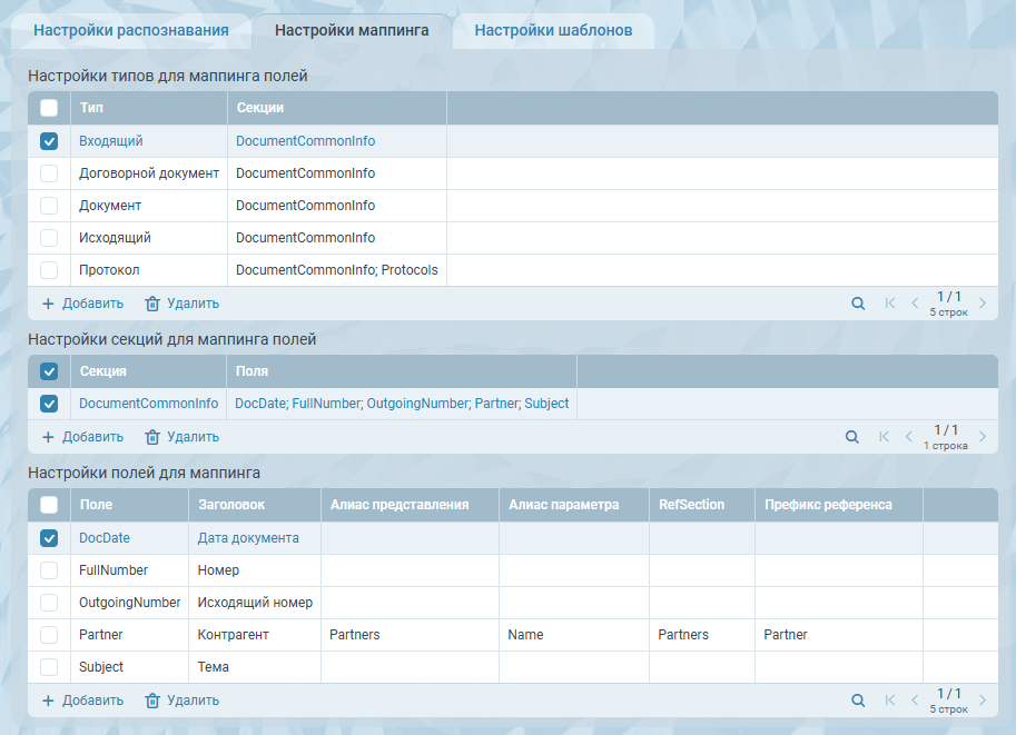 | Настройки секций для маппинга полей | Таблица со списком секций соответствующего типа, для которых будут добавлены поля для маппинга значений в ходе верификации документа в карточке операции OCR |