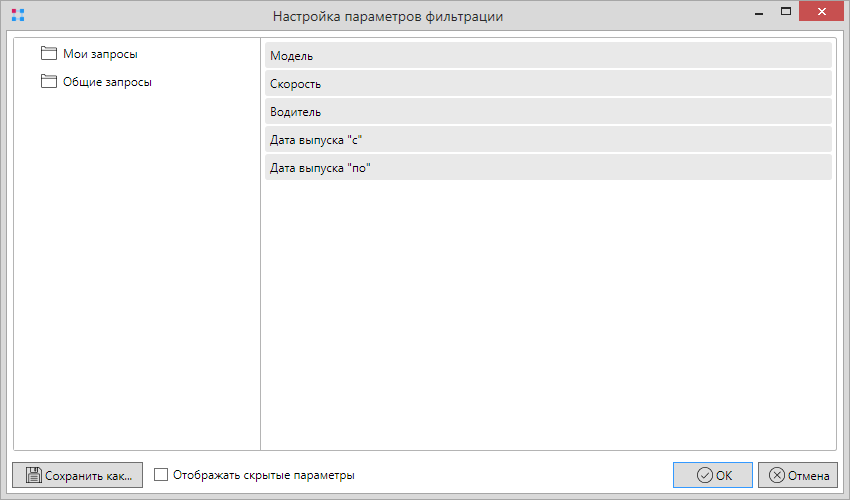 Для отображения параметров фильтрации воспользуемся виртуальной карточкой имеющей тип диалог. Виртуальная схема состоит из одной строковой секции Parameters. Она содержит колонки соответствующие параметрам представления AbCars.