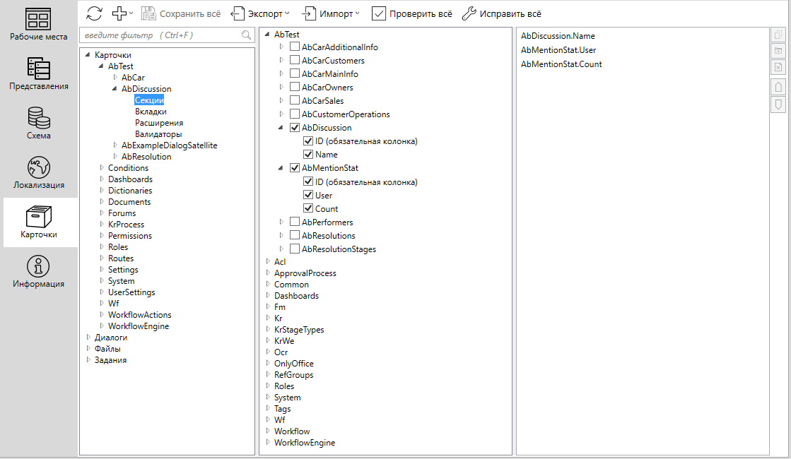 В раздел Секции нужно включить таблицы AbDiscussion и AbMentionStat со всеми полями. На рисунке ниже представлен раздел Секции: