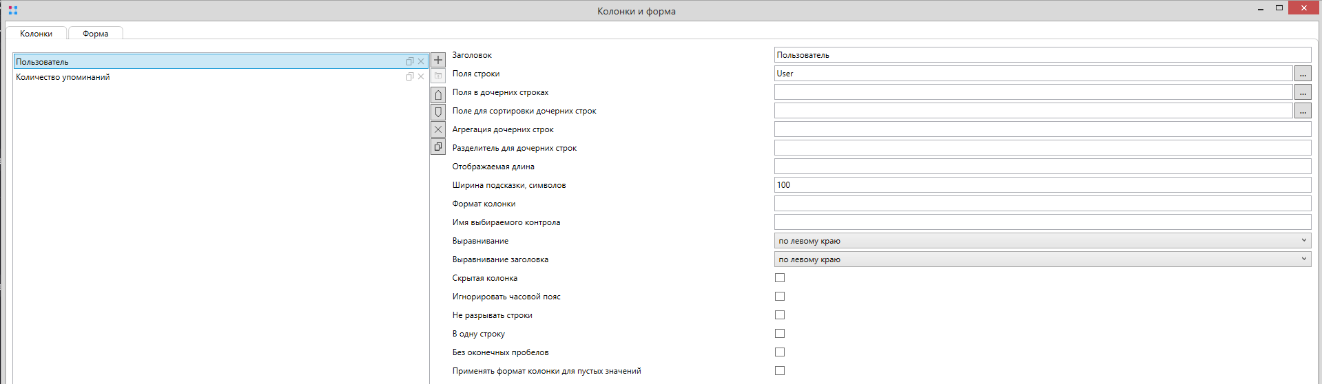 AbMentionStat. Для этой таблицы необходимо установить флаг Только для чтения. В разделе Колонки и форма вкладка Форма не требует изменений, так как пользователи не должны редактировать таблицу вручную. На вкладке Колонки нужно добавить две колонки:- Пользователь - колонка, ссылающаяся на поле