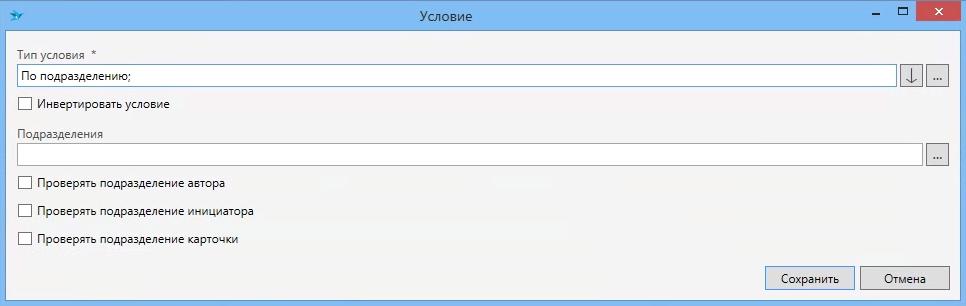 Для удобства настройки системы в ней есть такой тип карточки, как тип условия. Данный тип карточки позволяет реализовать свой тип условия с заданным редактором условия (поле Тип карточки настроек), местами возможности его использования (поле Места использования), описанием условия и собственно самим скриптом условия.