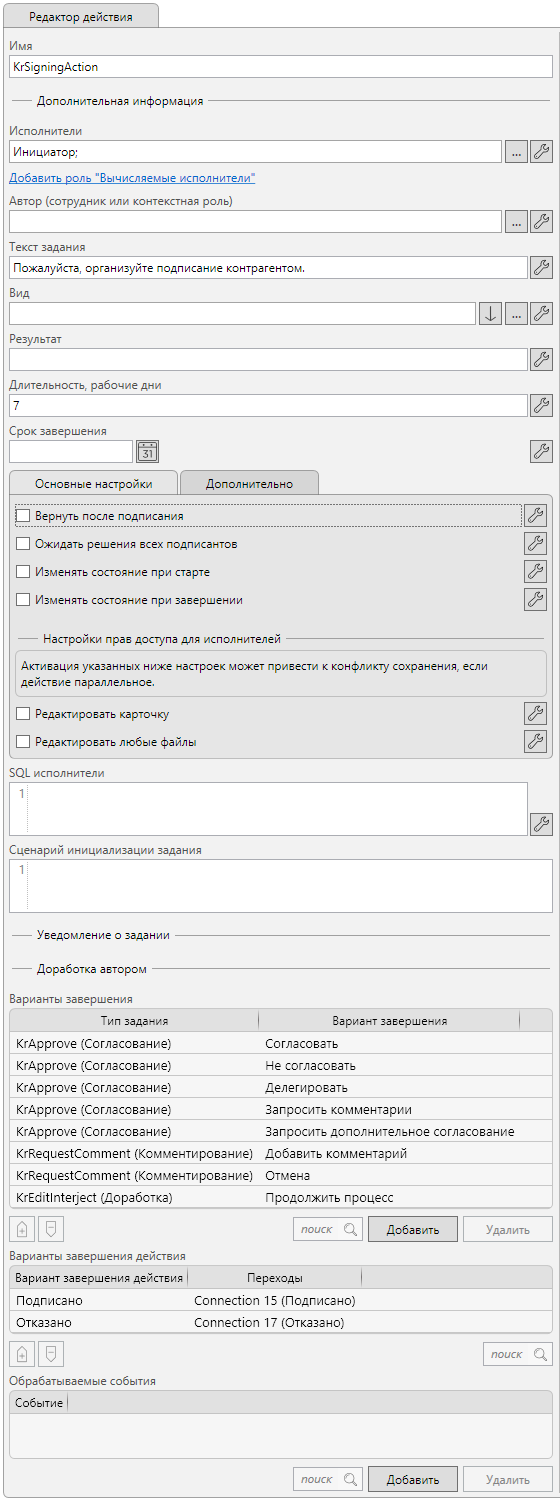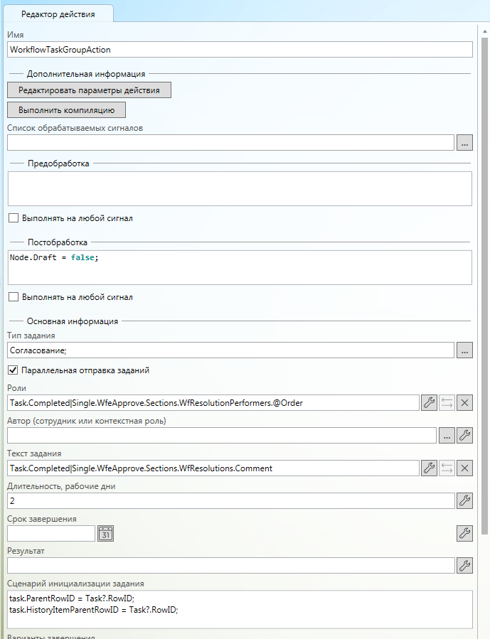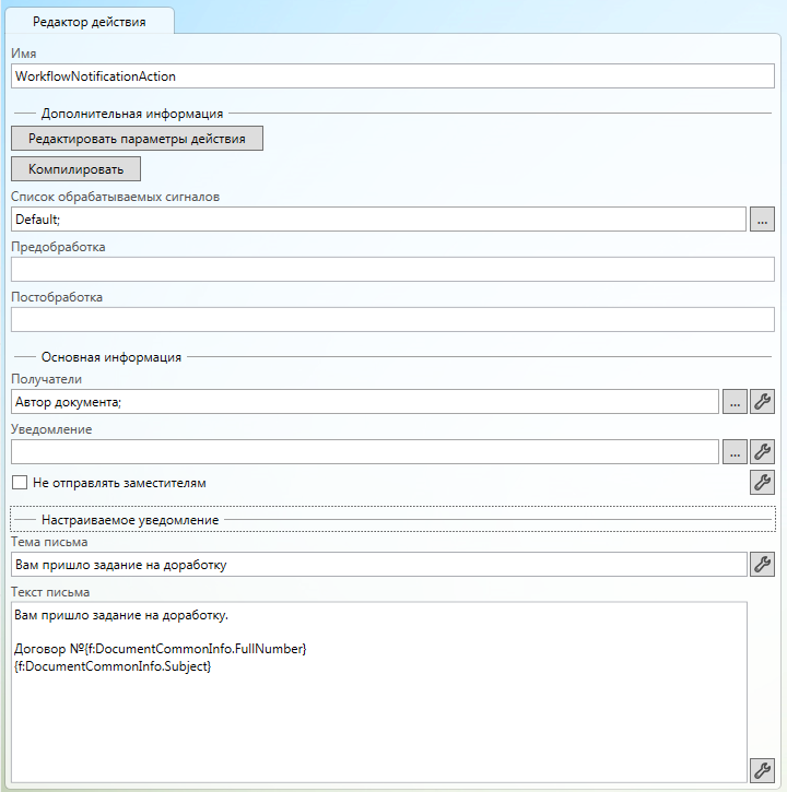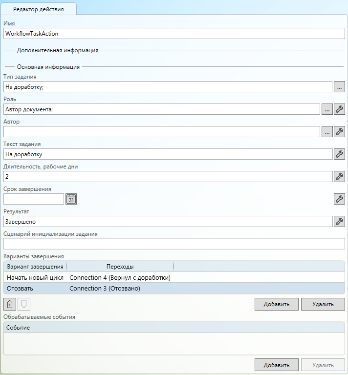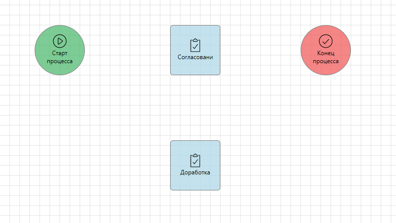 Это пример поэтапного создания процесса со своими настройками, где используется стандартное действие “Задание”. Однако для заданий согласования и доработки удобно использовать соответствующие действия из группы “Маршруты”, т.к. в них уже заложено много функциональности, например, запрос дополнительного согласования, делегирование и т.п. Примеры с использованием действий группы “Маршруты” описаны в следующем разделе.