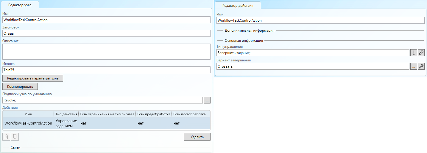 Теперь доработаем сам процесс. Добавим новый узел Отзыв с действием Управление заданием, из которого мы будем отправлять сигнал с отзывом задания в узлы согласования. В настройки узла укажем в поле Подписки узла по умолчанию тип сигнала Revoke. В само действие мы настроим так, чтобы оно завершало задание с вариантом Отозвано.