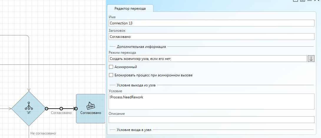 Добавим связь из узла Отзыв в новый узел согласования. Укажем новой связи настройку перехода Никогда не создавать экземпляр узла.