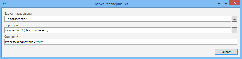 Настраиваем варианты завершения, чтобы при завершении с вариантом Согласовать мы переходили бы в узел Конец процесса, а при Не согласовать - на доработку.