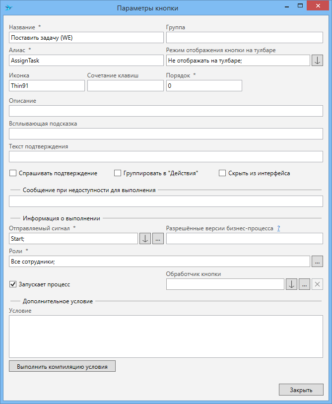 • Условие - определяет дополнительное условие, написанное на языке C#, которое выполняется для проверки доступа к кнопке. API для подобных условий можно посмотреть в разделе API скриптов в условиях для кнопок бизнес-процессов.