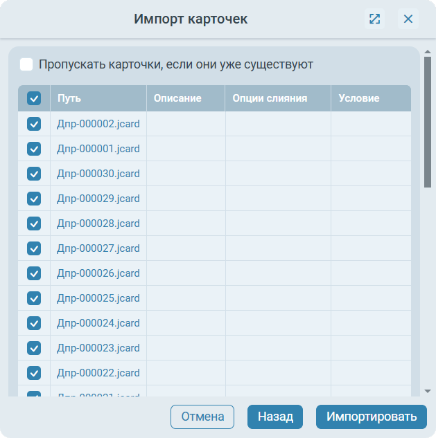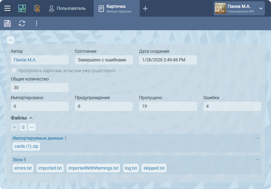- Неудачный импорт карточки - завершившаяся с ошибкой попытка импорта карточки.