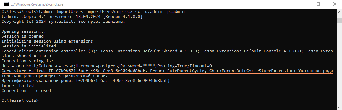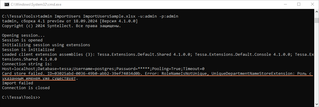 Или же, если в TESSA уже есть подразделение с таким же именем и на том же уровне, то в консоль будет выведена соответствующая ошибка: