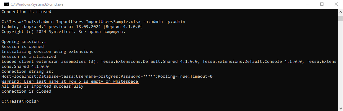 Логин сотрудника должен быть уникален. Если в файле встретится повторяющийся логин или сотрудник с таким логином уже есть в TESSA, то в консоль будет выведена ошибка: