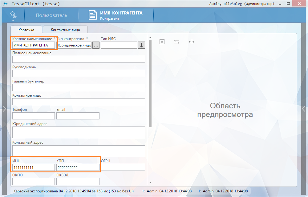Сначала давайте создадим контрагента, который станет нашим шаблоном. В web-клиенте в меню системы требуется выбрать глобальный пункт “Создать карточку→Справочники→Контрагент”. Заполним в нашем шаблоне поля “Краткое имя”, “ИНН” и “КПП”. Для простоты заполним их словами, которые потом будет легко найти в выгруженной карточке.