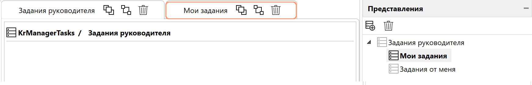 Связанные представления могут отображаться на рабочей области различными способами – на разных вкладках, на области, поделенной по вертикали или горизонтали или комбинацией упомянутых способов.