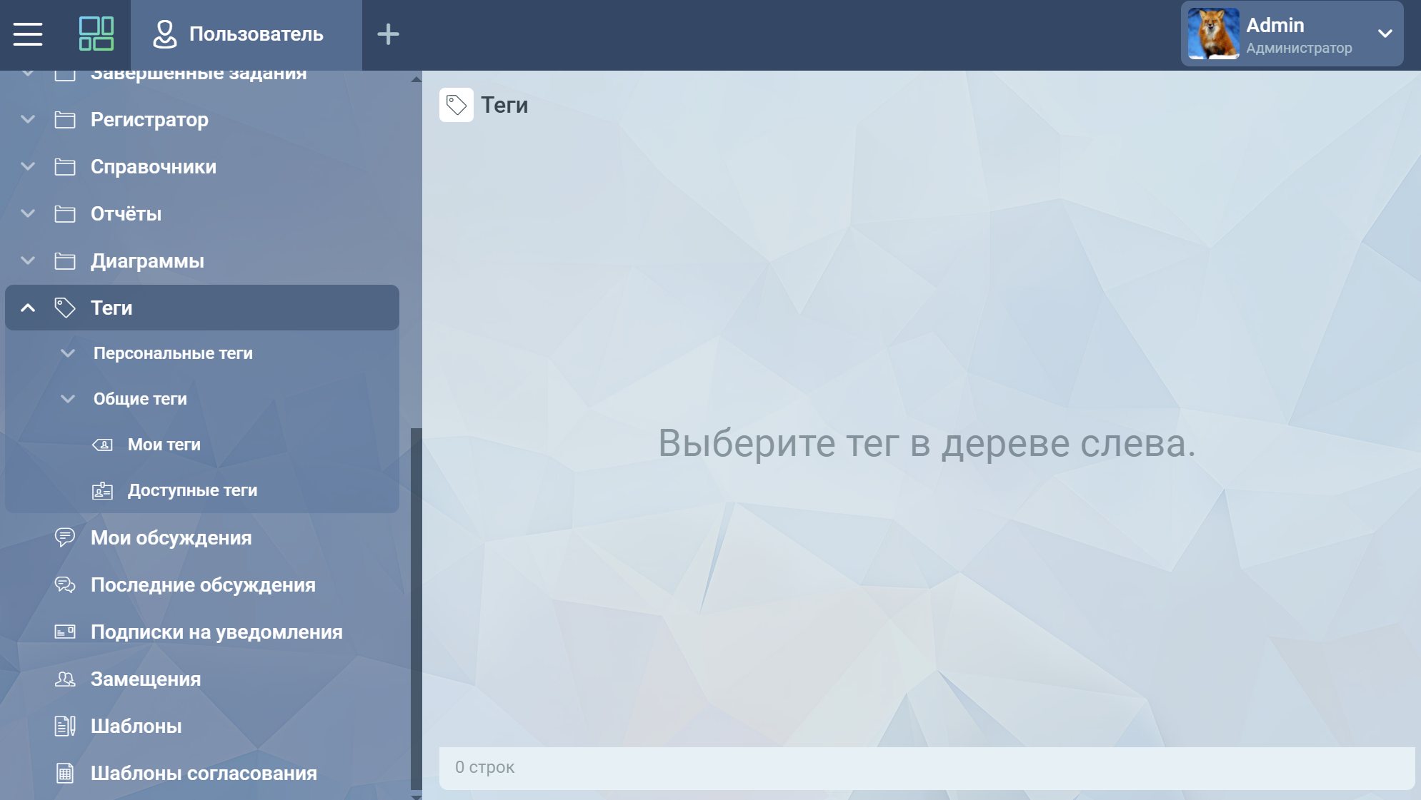 Для узла дерева с тегами может быть удобно вместо пустой таблицы вывести надпись “Выберите тег в дереве слева”. Этой цели служит расширение TagCardsViewExtension, которое можно добавить к узлу рабочего дерева.