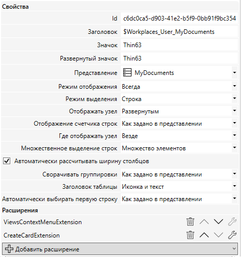 Для любого представления существует возможность добавить на панель инструментов кнопку создания карточки. Для этого необходимо в разделе “Рабочие места”, в дереве, выбрать нужный узел и в его свойствах нажать кнопку + Добавить расширение, затем выбрать расширение CreateCardExtension.