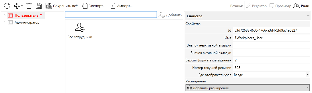 Настройка прав доступа к рабочему месту осуществляется добавлением ролей на узле с заголовком рабочего места.