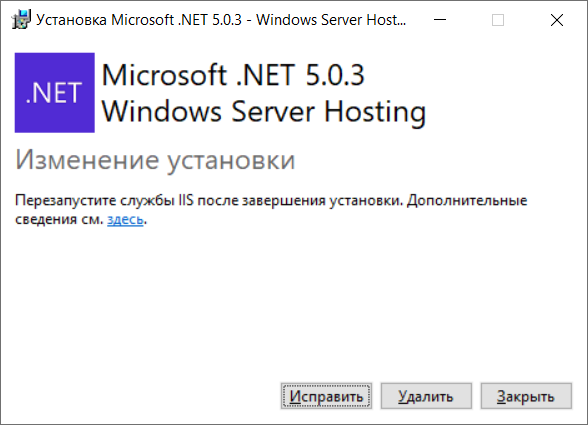 Перейдите в Панель управления\Программы\Программы и компоненты. И там выберите “изменить” на последней версии .NET Hosting bundle. После этого нажмите repair. Для применения изменений необходимо перезагрузить компьютер.