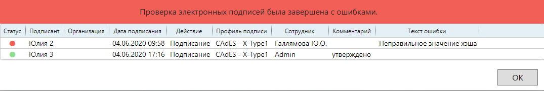 Результат проверки отображается в открывшемся окне, возможны следующие цветовые обозначения: