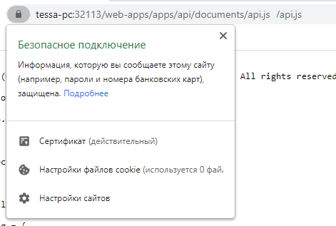 Откройте в браузере ссылку, указанную в карточке настроек. Должен отобразиться текст скрипта. В примере это адрес: https://tessa-pc:32113/web-apps/apps/api/documents/api.js