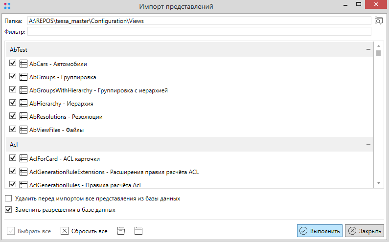 Для импорта представлений нужно перейти на вкладку Представления и нажать кнопку Импорт. В появившемся окне указать путь до папки из сборки Configuration\Views. Нажать кнопку Выбрать все. Также нужно установить галочку Заменить разрешения в базе данных. По завершении настройки - нажать кнопку Выполнить.