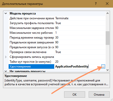 При установке локального инстанса и использовании администратора по умолчанию для работы веб-сервиса дополнительные параметры пула приложений можно не редактировать, оставив в поле Удостоверение -