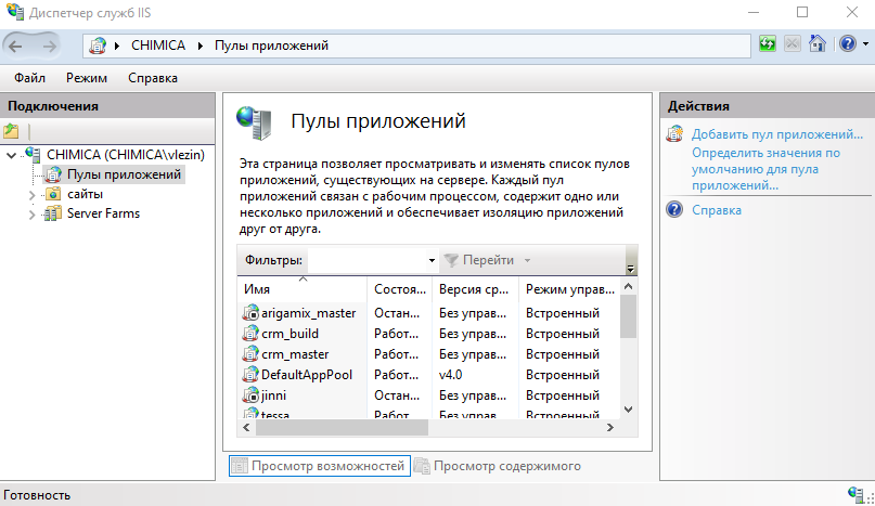 Пул приложений можно создать через Диспетчер служб IIS. Список созданных пулов сервера отображается в узле Пулы приложений.