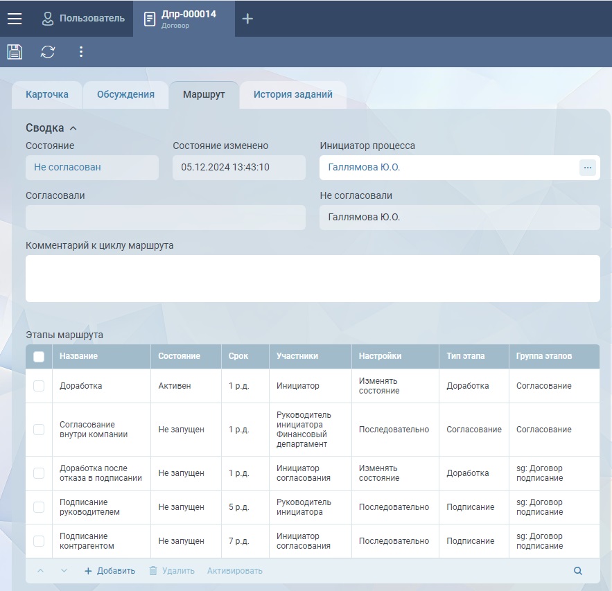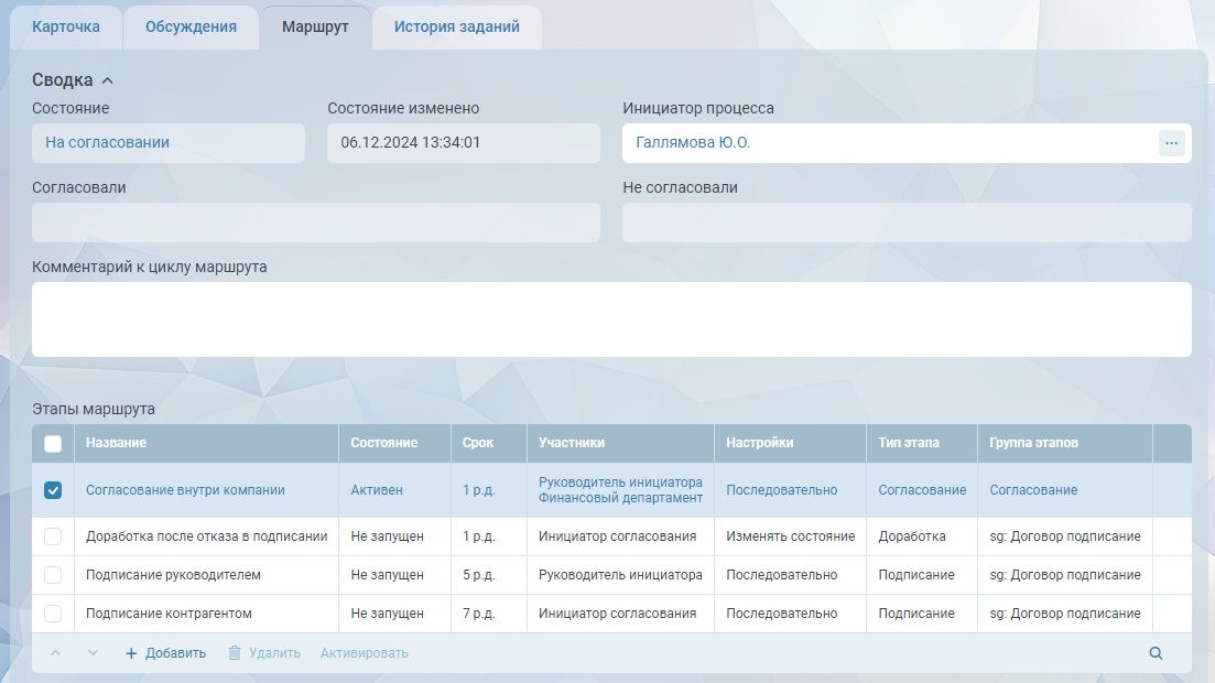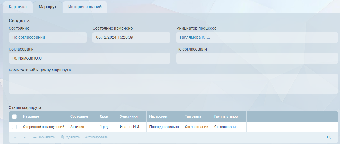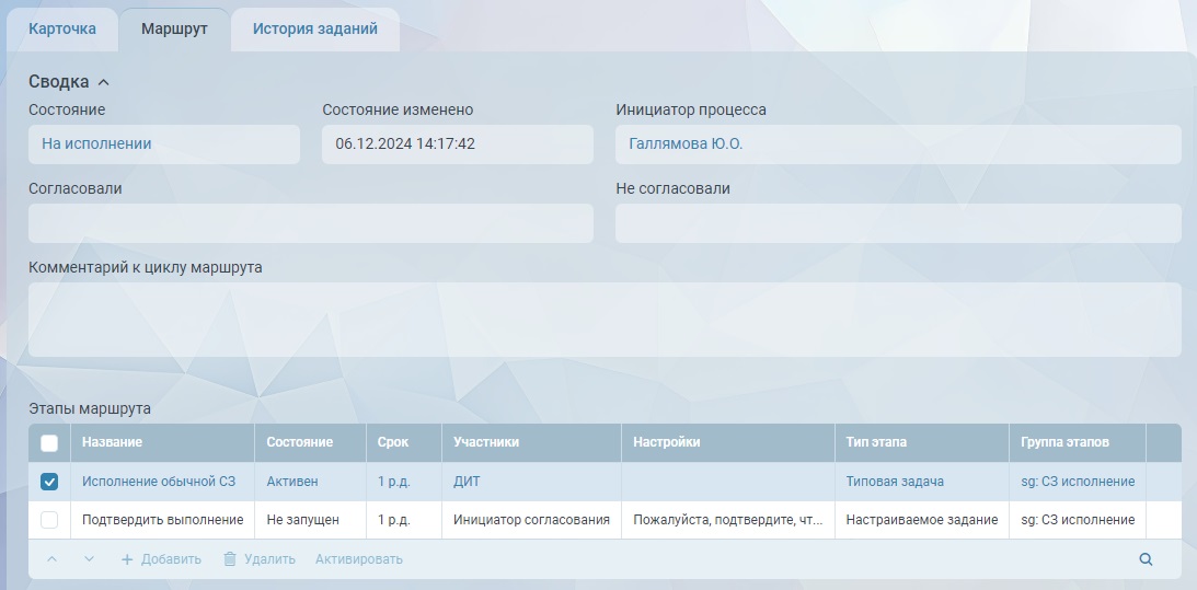- Основной процесс – это главный процесс маршрута по карточке. Он отображается на вкладке Маршрут карточки.