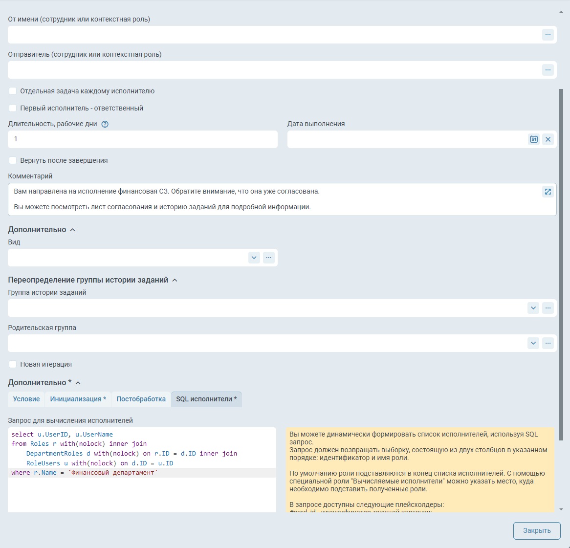 - Новая итерация - если флаг установлен, то будет создана новая итерация для группы истории заданий, заданной в поле Группа истории заданий.