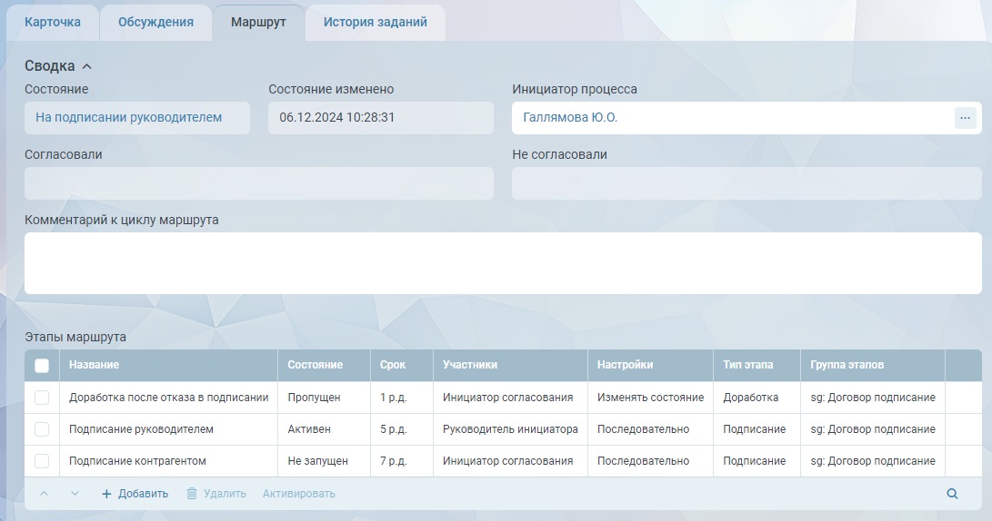 В подсистеме маршрутов есть масса возможностей по гибкой настройке прав доступа: на добавление новых этапов в маршрут обработки карточки документа, на перемещение, удаление и редактирование автоматически добавленных в маршрут этапов.