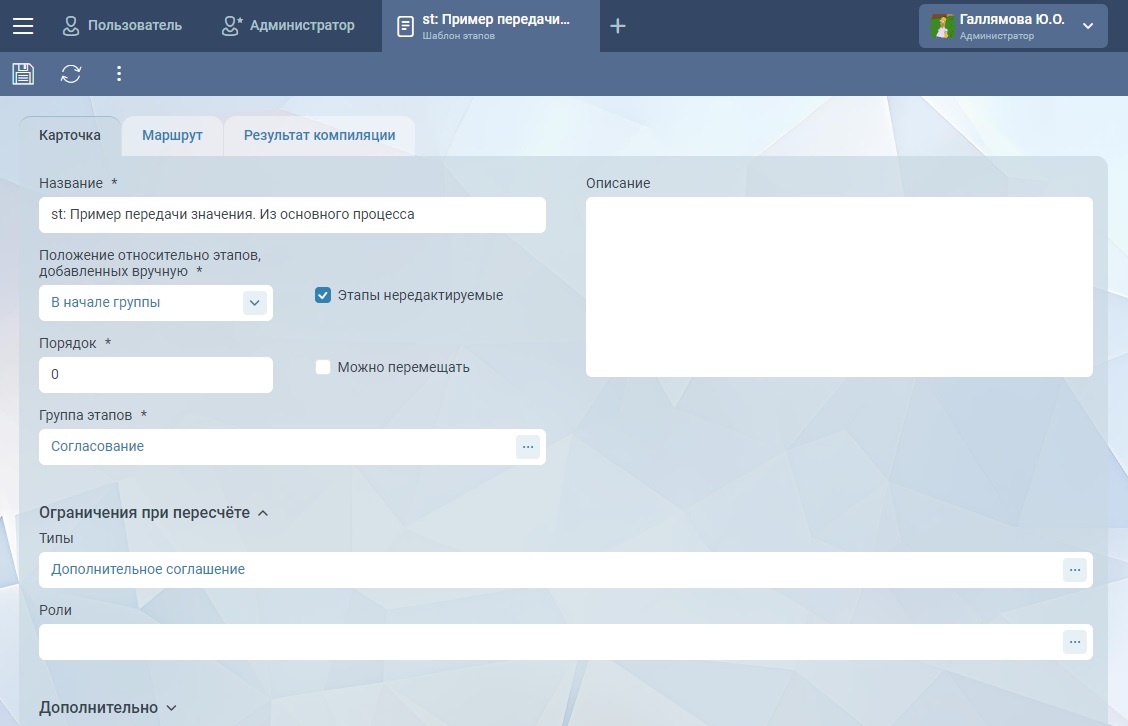 - Шаблон этапа - это специальная карточка, которая содержит в себе один или несколько заранее настроенных этапов маршрута. Подсистема строит маршрут документа, собирая этапы из различных шаблонов. Карточка содержит целый ряд настроек, управляющих правилами подстановки или пропуска этого шаблона по различным условиям. У каждого этапа в составе карточки шаблона также есть ряд настроек, позволяющих управлять его подстановкой в маршрут, а также организовывать различные действия при выполнении этапа.