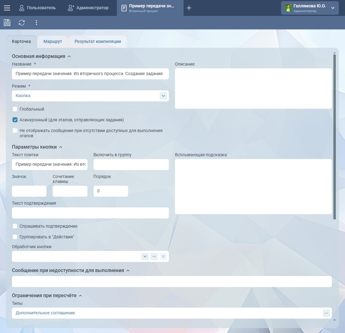 - Кнопка процесса - это карточка, позволяющая описывать новые кнопки (тайлы) в меню системы (это могут быть как глобальные кнопки - т.е. доступные в меню всегда, так и контекстные - доступные в меню только когда открыта карточка соответствующего типа). С кнопкой можно связать группу шаблонов, которая должна выполниться по ее нажатию или указать дополнительные параметры управления процессом.