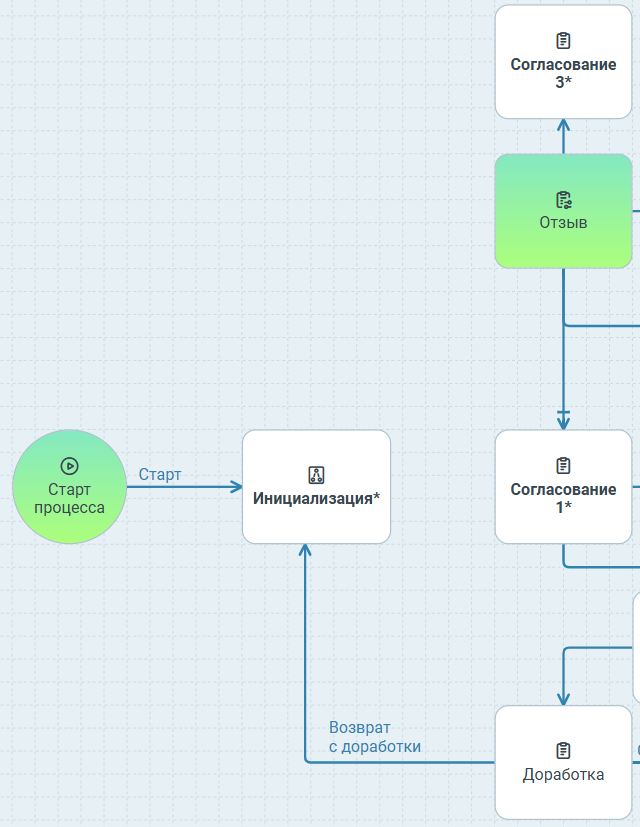 Отозвать- переход в узел Конец процесса.