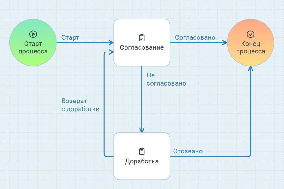 Реализуемый в данном примере процесс можно настроить более простым способом, используя действия из группы Маршруты. Пример их использования см. в разделе Примеры процессов с применением действий из группы Маршруты.