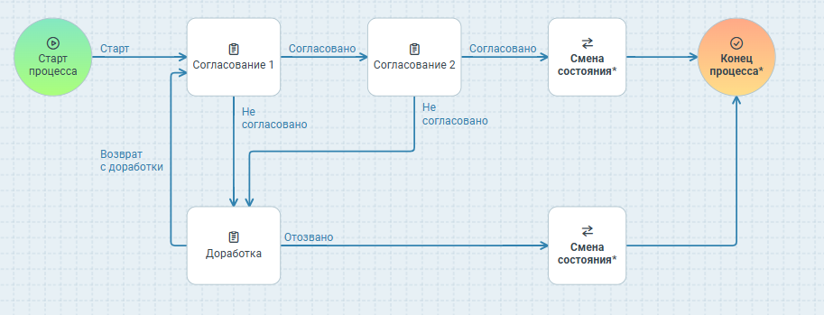 Следующим этапом добавляется действие типа Смена состояния. Данное действие можно вставить между вторым согласованием и узлом Конец процесса, а также между узлами Доработка и Конец процесса. Каждому добавленному узлу в действие смены состояния ChangeStateAction нужно настроить соответствующее состояние.