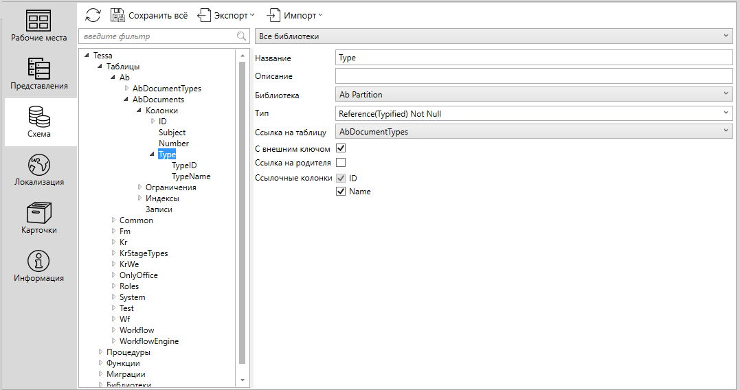 1. Указать таблицу, например, AbDocumentTypes в поле Ссылка на таблицу, т.е. указать, что колонка Type содержит ссылку на таблицу AbDocumentTypes. Первичным ключом этой таблицы является колонка ID, поэтому в узел колонки “Type” была автоматически добавлена колонка “TypeID”. Физически в БД для таблицы будет создана именно колонка TypeID, в то время как колонка Type определена в метаинформации схемы данных для использования в платформе.
