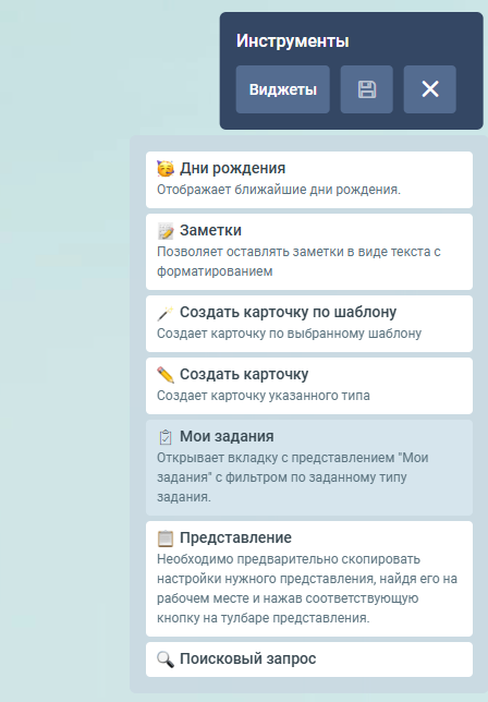 Теперь определим тип виджета, который будет использоваться для создания виджетов “Мои задания”, так как виджеты в дашборде напрямую не создаются.
