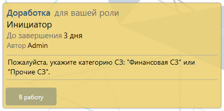 Мы попадаем на уже знакомый нам этап исполнения заявки, только исполнителем будет другая роль, потому что категория заявки “Финансовая СЗ”.