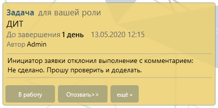 Если инициатор не подтверждает выполнение заявки, то система вновь отправляет задание исполнителю заявки с комментарием недовольного инициатора.