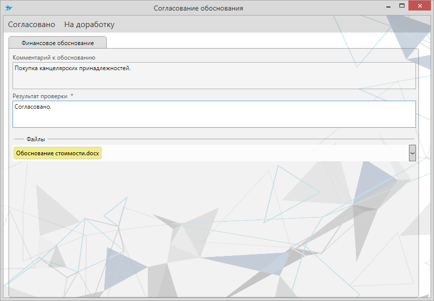После отправки на согласование будет предложено предоставить финансовое обоснование или ввести комментарий.