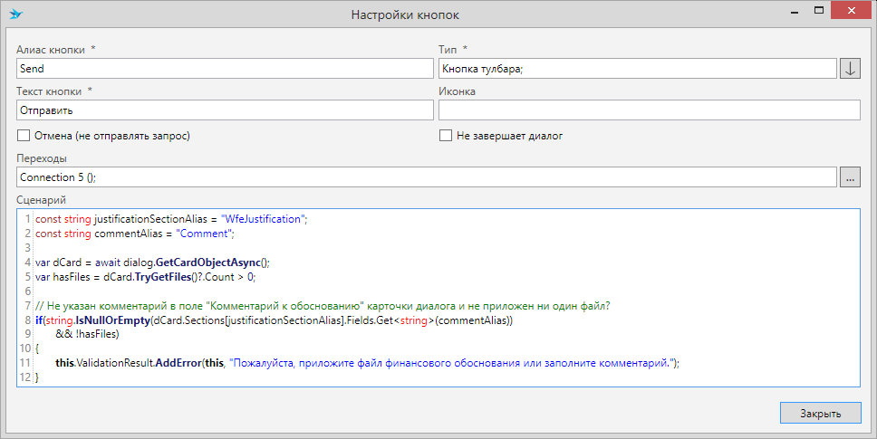 Добавьте кнопку бизнес-процесса “Финансовая СЗ” и настройте её как показано на рисунке: