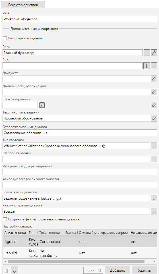 Обратите внимание на установленный флаг Без отправки задания. Он позволяет использовать диалог в глобальных процессах, т.е. без использования карточки.