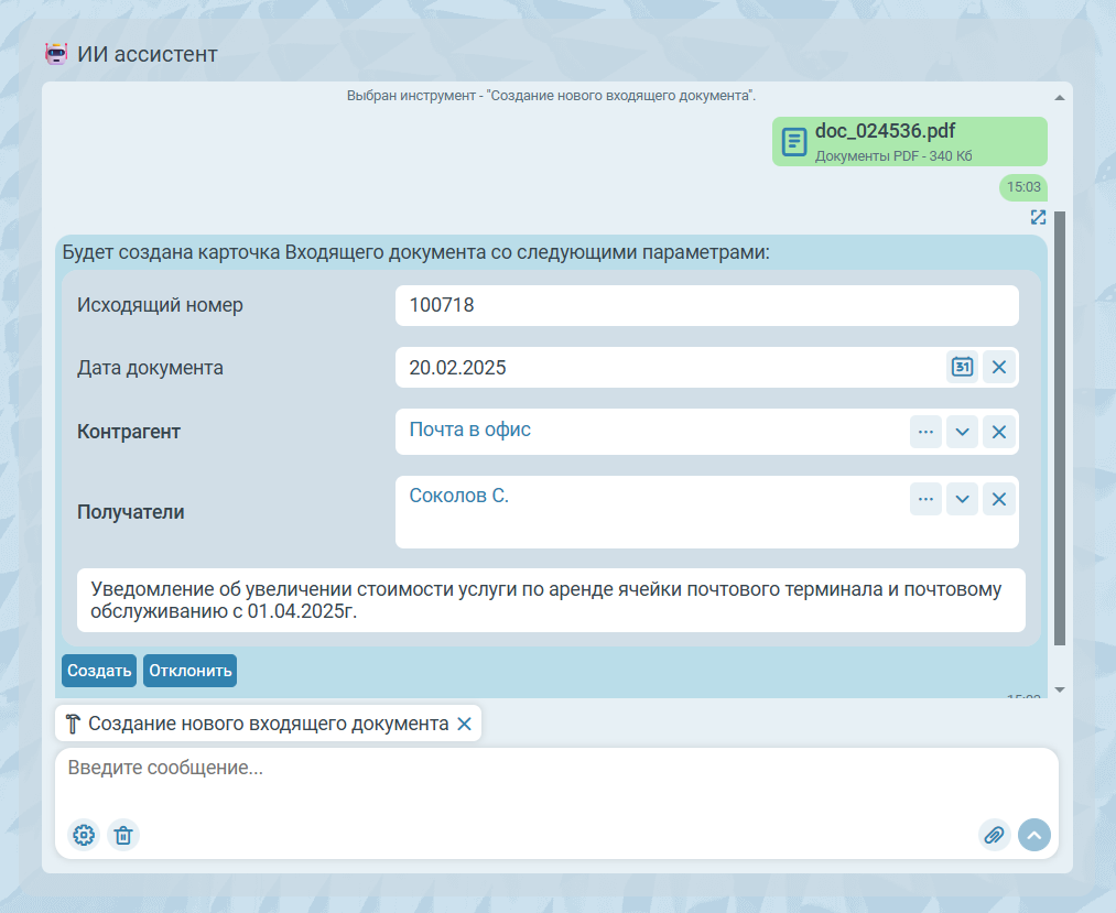 Для того, чтобы зарегистрировать новый входящий документ, необходимо выбрать Создание нового входящего документа в списке инструментов ИИ ассистента и прикрепить к сообщению файл документа в одном из поддерживаемых форматов.