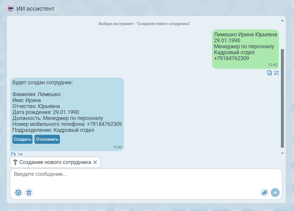 Нажатие кнопки Отклонить в ответном сообщении ассистента прерывает создание сотрудника. Пользователь может отправить новое сообщение в рамках текущего инструмента.