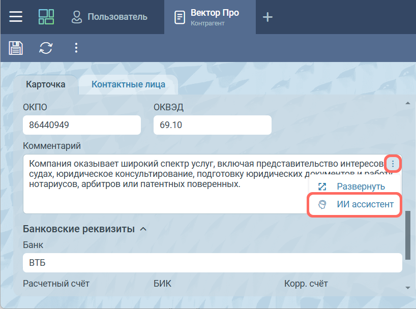 Инструмент “Улучшение текста” предназначен для преобразования текста: исправления в нём орфографических, грамматических, пунктуационных ошибок, опечаток, а также приведения текста к официально-деловому виду. Инструмент доступен к вызову из списка инструментов в чате с ИИ ассистентом на дашборде, а также из любого многострочного текстового поля в карточках системы. Для этого указанные поля должны быть доступны для редактирования.
