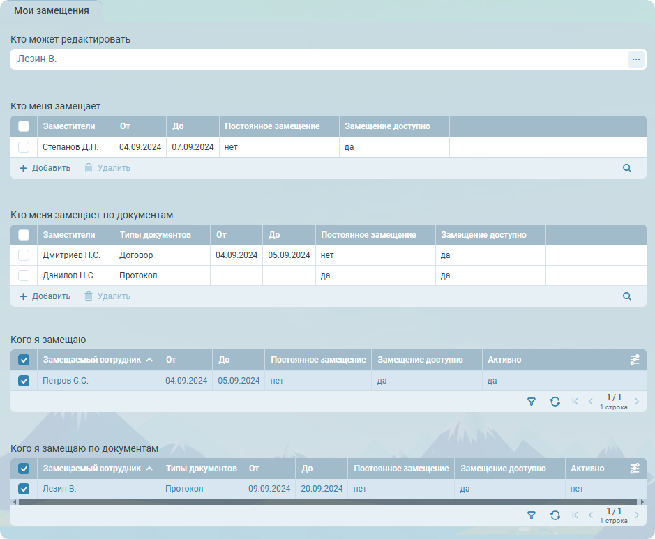 Сотрудник может ограничить набор предоставляемых прав. В таком случае заместитель получит доступ к заданиям и правам только определенных типов документов. Настроить список заместителей можно через таблицу Кто меня замещает по документам, нажав кнопку Добавить.