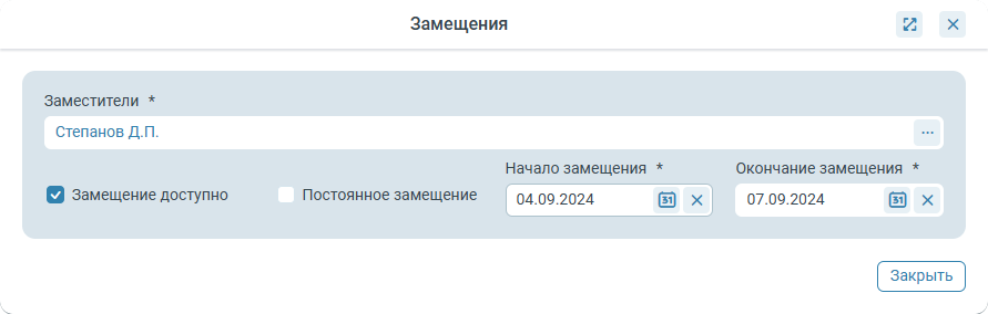 Замещение может быть не ограничено по сроку. Для этого нужно отметить флаг Постоянное замещение. В ином случае необходимо указать первый и последний дни в полях Начало замещения и Окончание замещения соответственно.