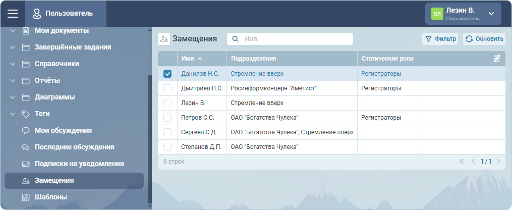 Чтобы просмотреть всех сотрудников, для которых можно настроить заместителей, нужно открыть представление Замещения на рабочем месте Пользователь.