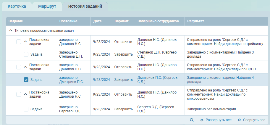 Завершенные заместителями задания также фиксируются в Истории заданий. В колонке Завершено сотрудником отображается информация формата