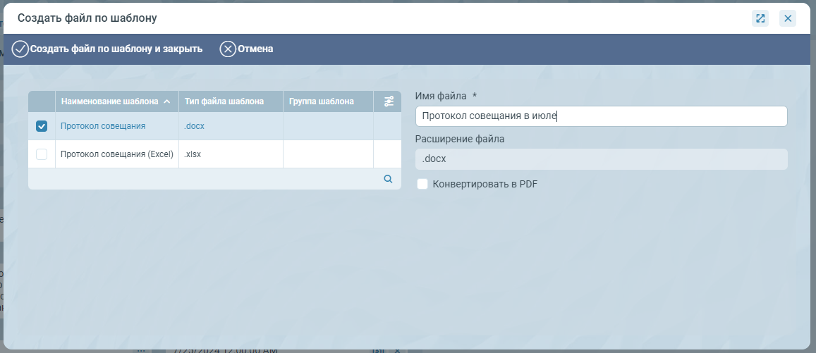 Расширение итогового файла изменить вручную нельзя. В случае выбранной опции Конвертировать в PDF, расширение будет .pdf, в остальных случаях файл будет иметь тот же тип, что и файл шаблона.